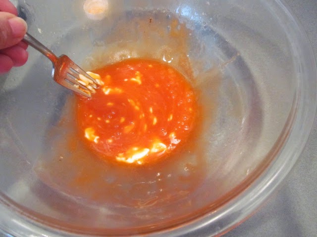 While they are baking, make your sauce by pouring hot sauce in a bowl. Use a bowl large enough to hold all the wings. Add 1 tablespoon of butter to sauce. Add a few drops of Tabasco. You can add more of less depending on how hot you want your wings.