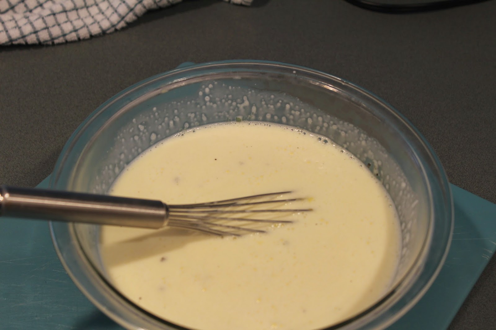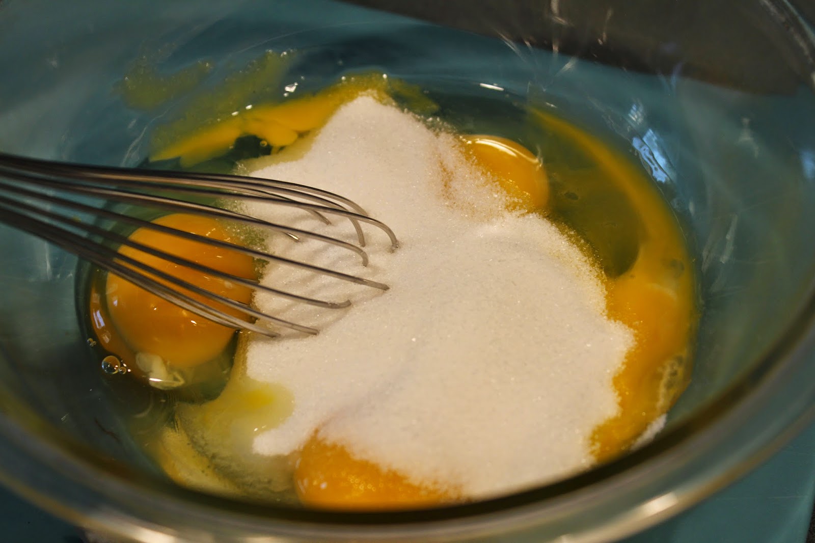 Place your eggs and yolks in to a bowl. Whisk together the eggs, yolks, and sugar until it becomes pale yellow and thicker. Start to boil water in a pot on the stove for your water bath.