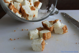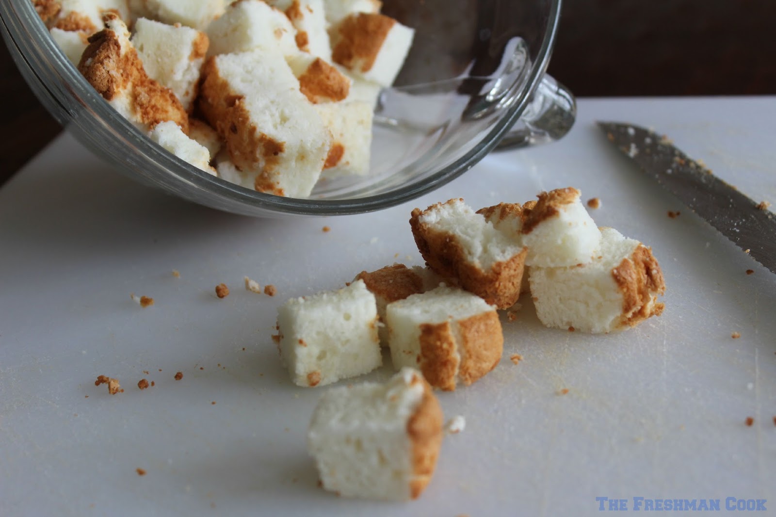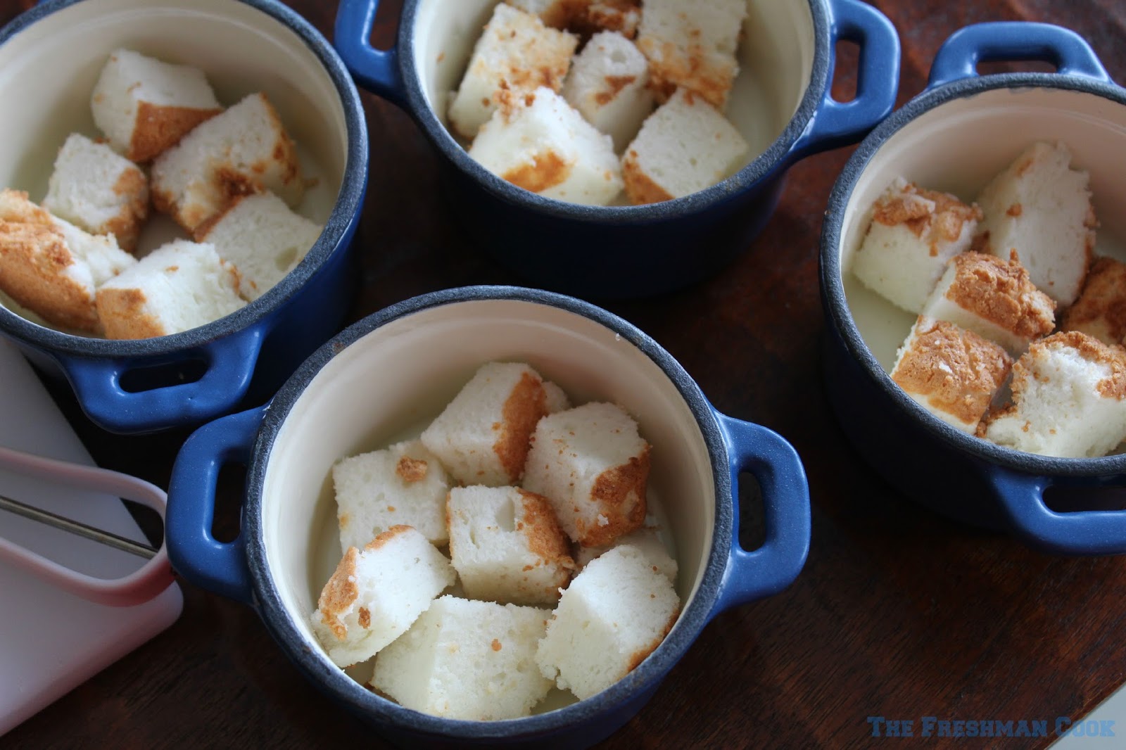 Place a few pieces of the angel food cake on the bottom of your bowls.