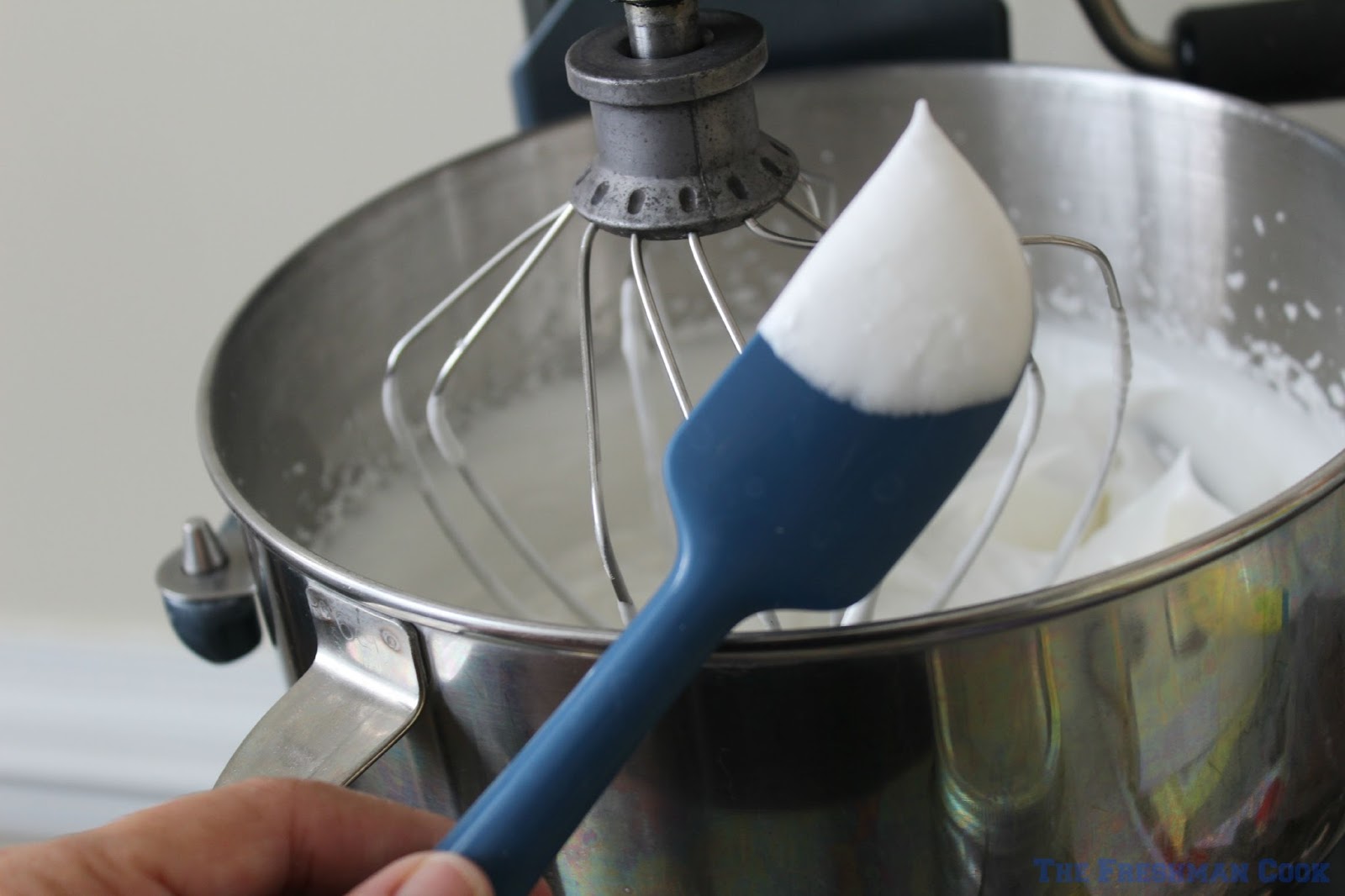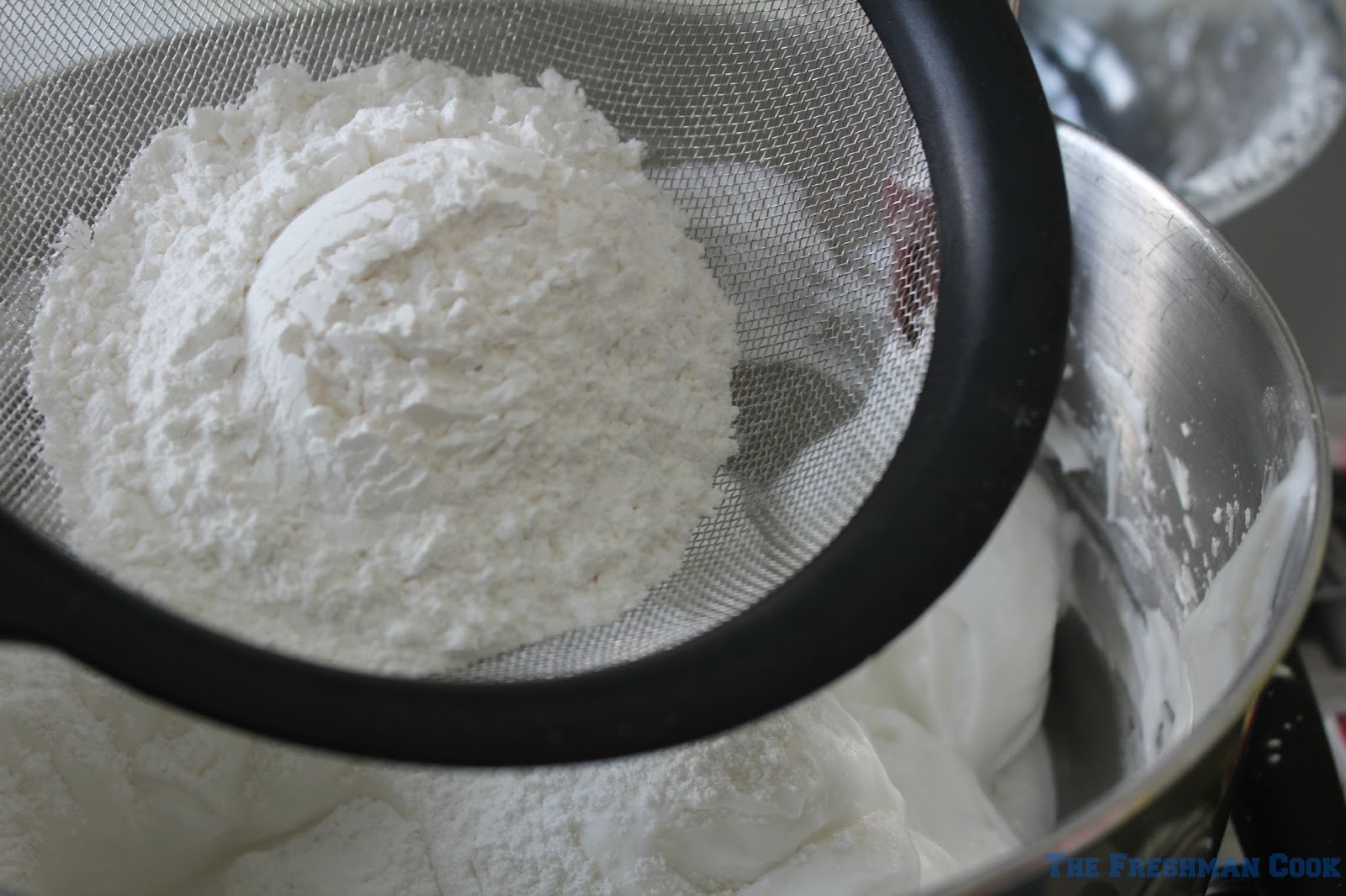 Sift approximately 1/4 of the sugar and flour mix into the meringue. Fold in to the meringue. Add the rest of the sugar flour mix, 1/4 cup at a time, fold in after each addition.