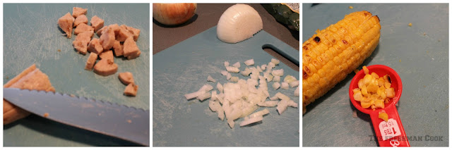 Slice the sausage, lengthwise, into four pieces, then chop the sausage into small slices. Chop the onion into small pieces. Grill the corn over medium heat. Slice the corn from the cob. Add the sausage, onion, and corn to the batter. Pour into the mini bundt pan.
