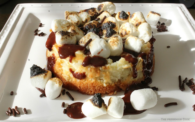 Use a kitchen torch to brown the marshmallows. Sprinkle chocolate sprinkles over the cheesecake.