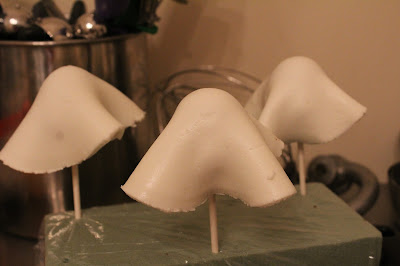 Have styrofoam ready to hold your ghosts. Place a dab of water on the top of the brownie pop. Fold the circle of fondant over the brownie pop and arrange the folds of the ghosts to look like they are flowing.