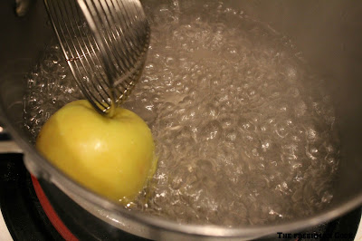 - Take each apple and dunk it into boiling water for 30 seconds, remove and wipe dry. This will remove the wax from the apples.