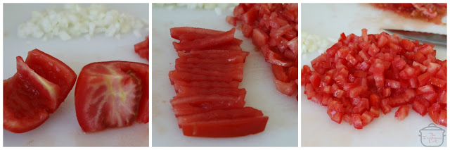 Cut your tomatoes in half. Remove all the seeds. Slice the tomatoes into thin pieces, as shown in the middle picture. Chop the tomatoes in to small pieces as shown.