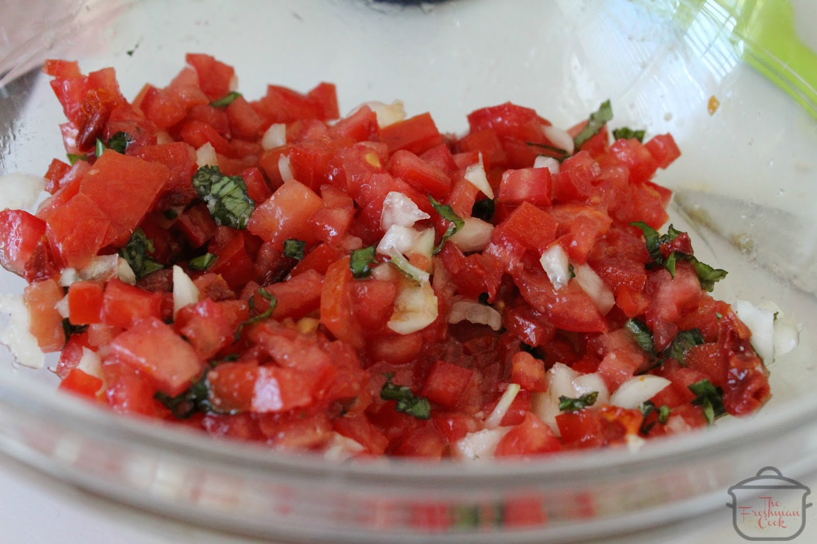- Place onions, both tomatoes, and the chopped 6 leaves of basil into a bowl. Add the extra virgin olive oil, minced garlic, salt and pepper, and the chopped garlic clove. Place plastic wrap on the surface of the mix. Set aside for 1-2 hours.