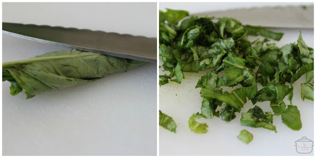 Remove 6 pieces of basil from their stems. Stack the leaves on top of one another. Roll up so the basil looks like a cigar. Chop the basil into small pieces, as you move down the basil.