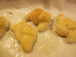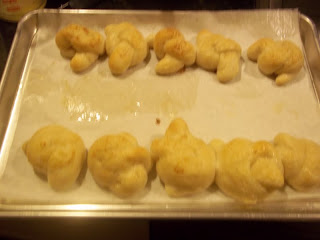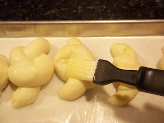 Place the knots on a cookie sheet covered with parchment paper. Spray plastic wrap like we did earlier, then cover the knots and place it someplace warm to let them rise. It may take about 3 hours. The sprayed wrap will ensure that the plastic won’t stick to the dough.