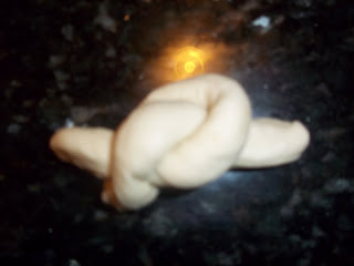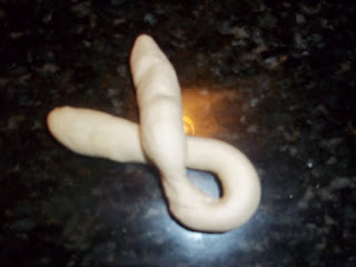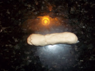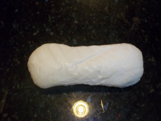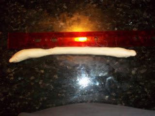and let it sit for about an hour to defrost. Once it is softer, cut the bread loaf in half, and then each half in half~you end up with 4 pieces. From each of the 4 pieces, cut 5 slices. I’m sorry for no pics of this, but you know what I mean. You will end up with 20 pieces, which will become 20 rolls. Start rolling your roll into a thin rope.
