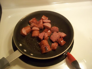 Cut the half of the Kielbasa, and then heat it in the fry pan.