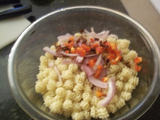 Add the onion, the red pepper, and the tomatoes, to the bowl.