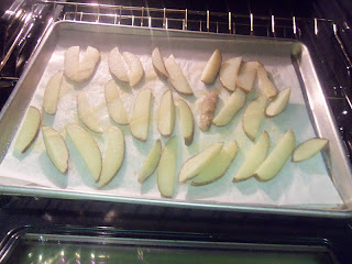 Sprinkle the fries with garlic powder and light salt. Bake. About half way through the baking, turn each wedge over so the other side can bake easier.