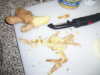 Peel the fresh ginger with a veggie peeler, then chop with a knife.