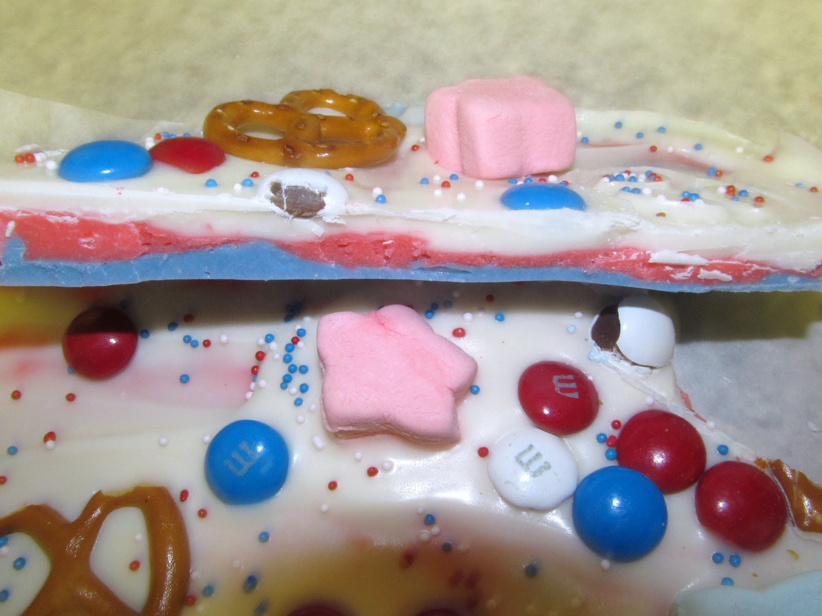 This is Day 6 of our “15 Days of Red, White, and Blue! Today we made a simple holiday bark. We used red, white, and blue M and M’s, tiny twist pretzels, holiday marshmallow stars, and sprinkles. We did make this bark just slightly different, however. We made the bark 3 layers with each layer a different color! Very festive!