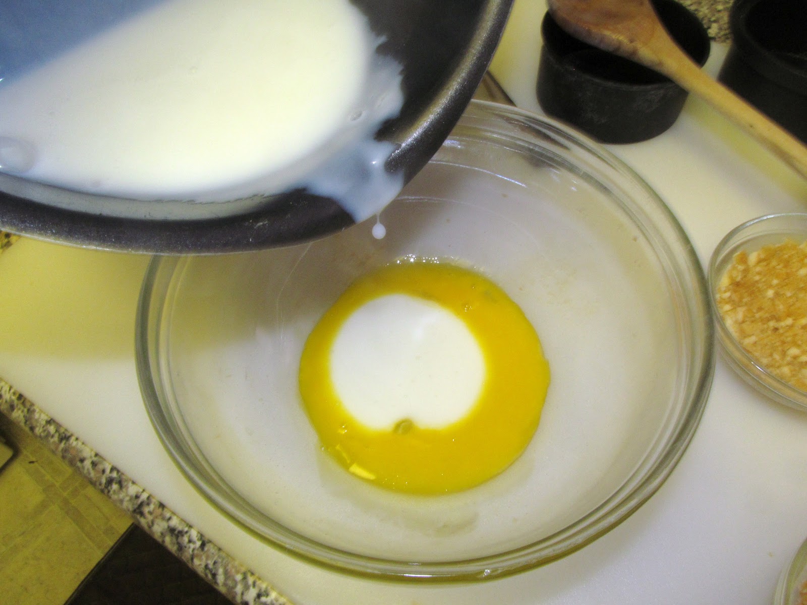 Stir a small amount of the hot milk mixture into the egg mix.