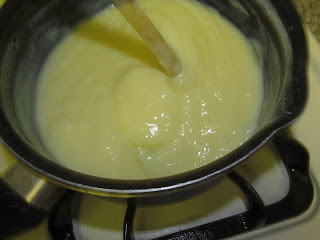 After it has thickened, remove from the heat. (mine is still on the stove, but on a turned off burner) Add your vanilla and butter, stirring until the butter is completely blended.