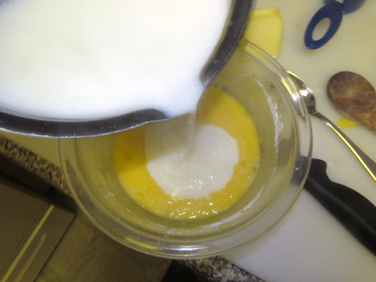 When your milk comes to a boil, drizzle about 1/2 of the milk into the egg mix. This is called tempering the eggs. You slowly add the milk so that the eggs can get used to the high temperature and they won’t curdle or cook. As you are pouring, stir or whisk the eggs.