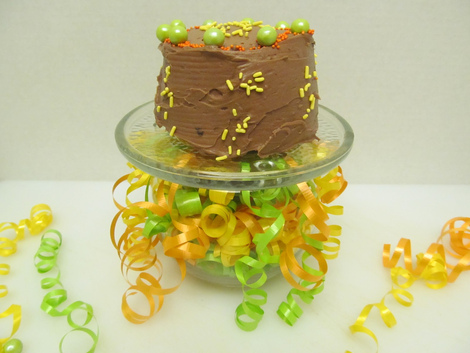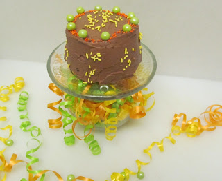 I decorated around the edge of the top layer with Orange Non Pareils, then I placed 10 Pearl Lime Sixlets around the edge also. I sprinkled Yellow Jimmies on top and on the side.