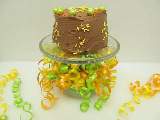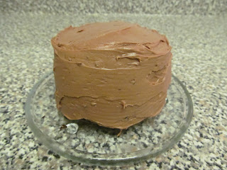 I split the cake in half, and iced the top of the bottom layer. The mini cake pans are very tall, so it worked well. Then I iced the sides and top of the cake. I placed the cake on a candle plate. Perfect fit!