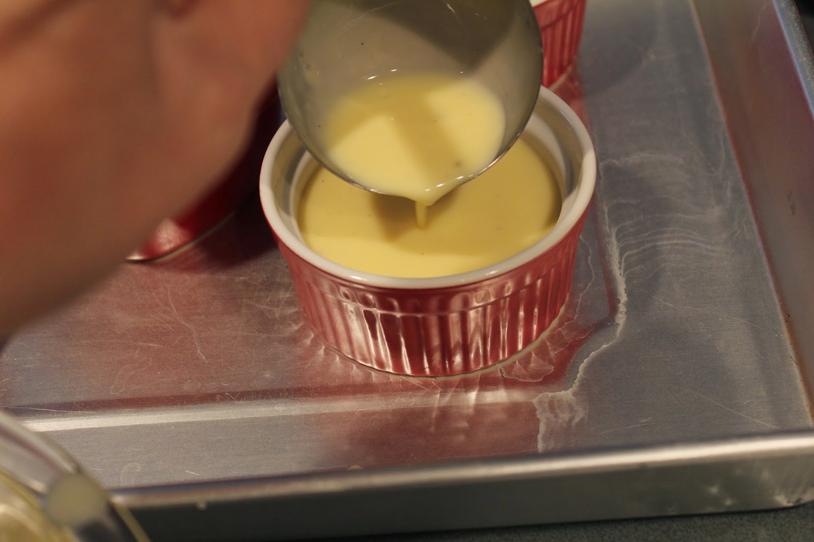 Begin filling the ramekins with the custard.