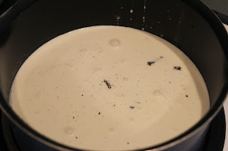 Scrape 1 Vanilla Bean into your cream. I don’t have pics of this, but I’ll add some later. Take a vanilla bean and cut down the long side. Open it and lay it flat. A small paring knife works great for this. Then use the knife to scrape the bean pulp that is inside. It will stick to the edge of your knife. Knock it off the knife and in to your cream. Stir a little to get it integrated. Cook until it begins to steam.