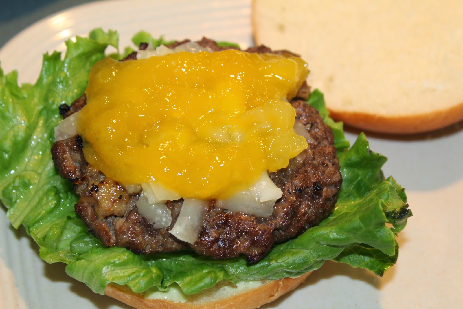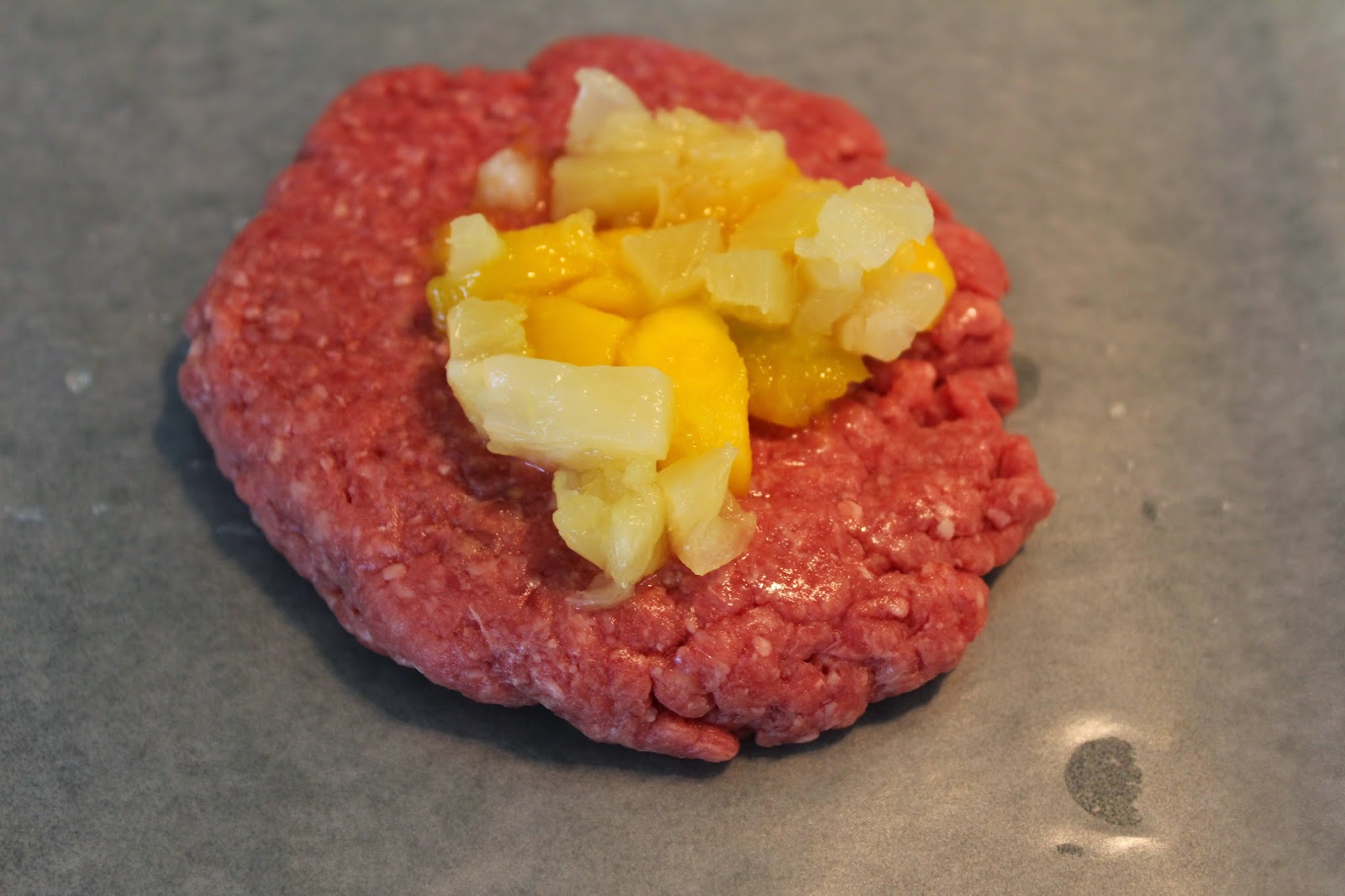 What is a cheeseburger in paradise? Well, for me, it is a cheeseburger that I made myself. It’s grilled outside on the grill and it is topped with tropical goodness. It is eaten on the backyard porch, because that is my paradise! I stuffed my ground chuck burger with little chunks of pineapple and mango. Then I topped it with manchego cheese and fruit sauce. If you are not in paradise, you will be when you eat this!