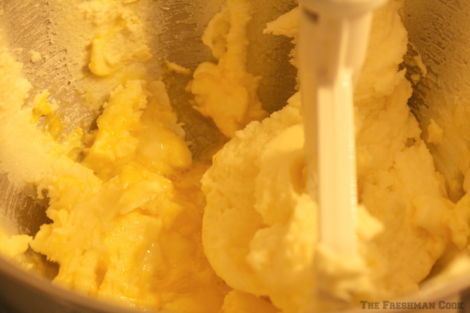 Place the flour, baking powder, and salt in a bowl and set aside. Add the butter to the mixing bowl. Mix for 30 seconds, then add sugar. Cream together until light and fluffy.