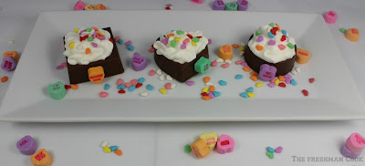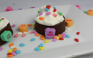 Use chocolate on a toothpick and smear just a dab on the candy hearts, and attach them to the chocolate cups. Use the pastry bag and fill the inside of the cups with the whipped cream. Decorate top of the cream with candy heart sprinkles!