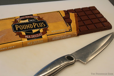 Candy Heart Sprinkles Chop off 20 squares to start with. You can always add more to the double boiler if needed. I like to use this chocolate from Trader Joe’s. It is a Belgium chocolate which I think is the best. For about seven years, I ordered Callebaut chocolate from a store in New England, but after trying this chocolate, I never looked back. It is a great price and it tastes wonderful.