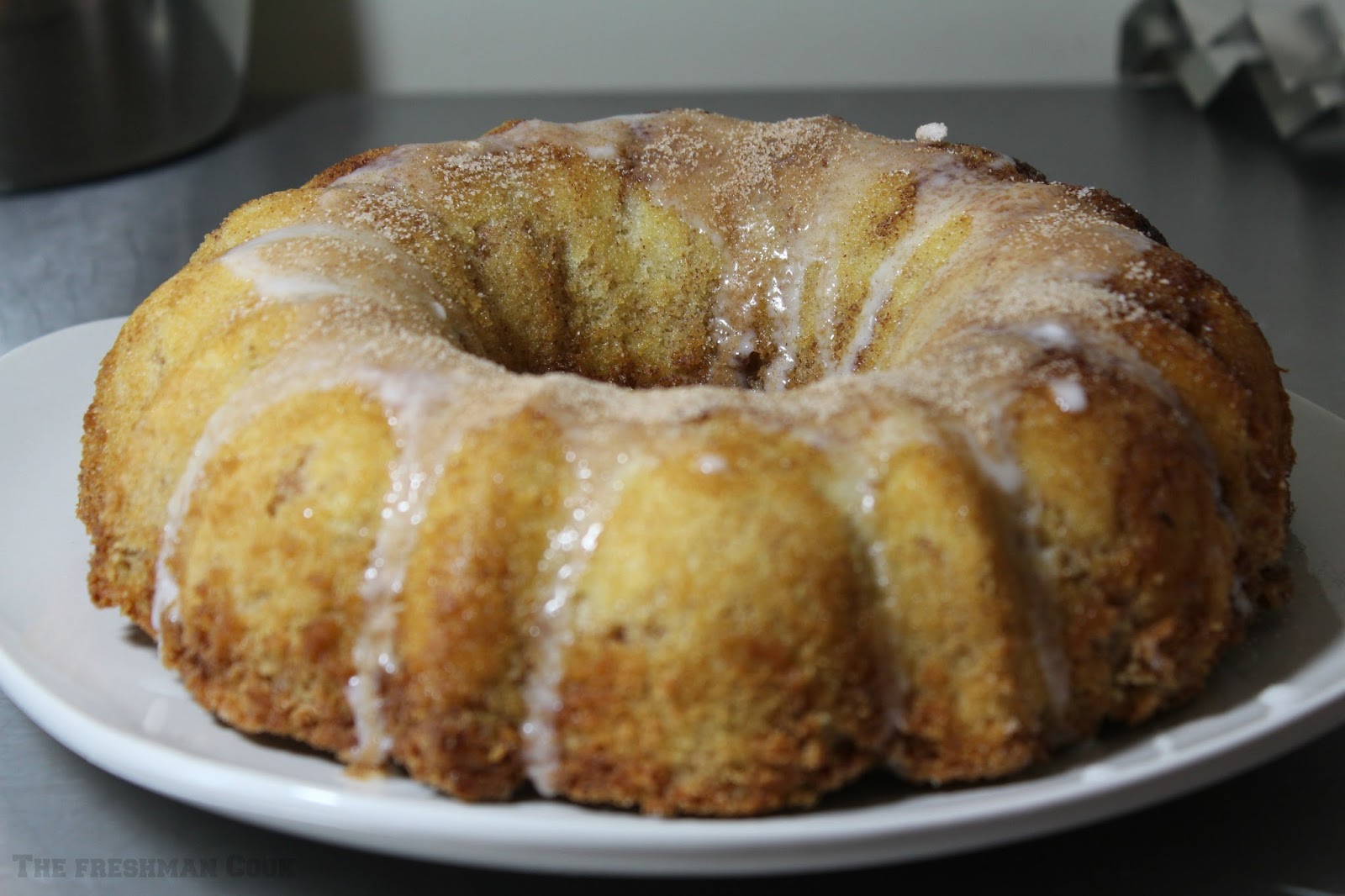 Drizzle the glaze over the cake. Sprinkle the cinnamon and sugar mix over the glaze!