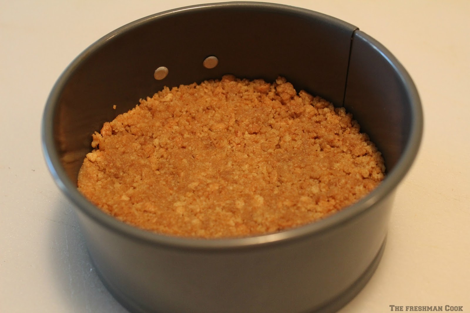 Mix the crushed graham crackers with the melted butter. Place graham cracker mix into each mini spring form pan. Compact it down on the bottom of the pan.