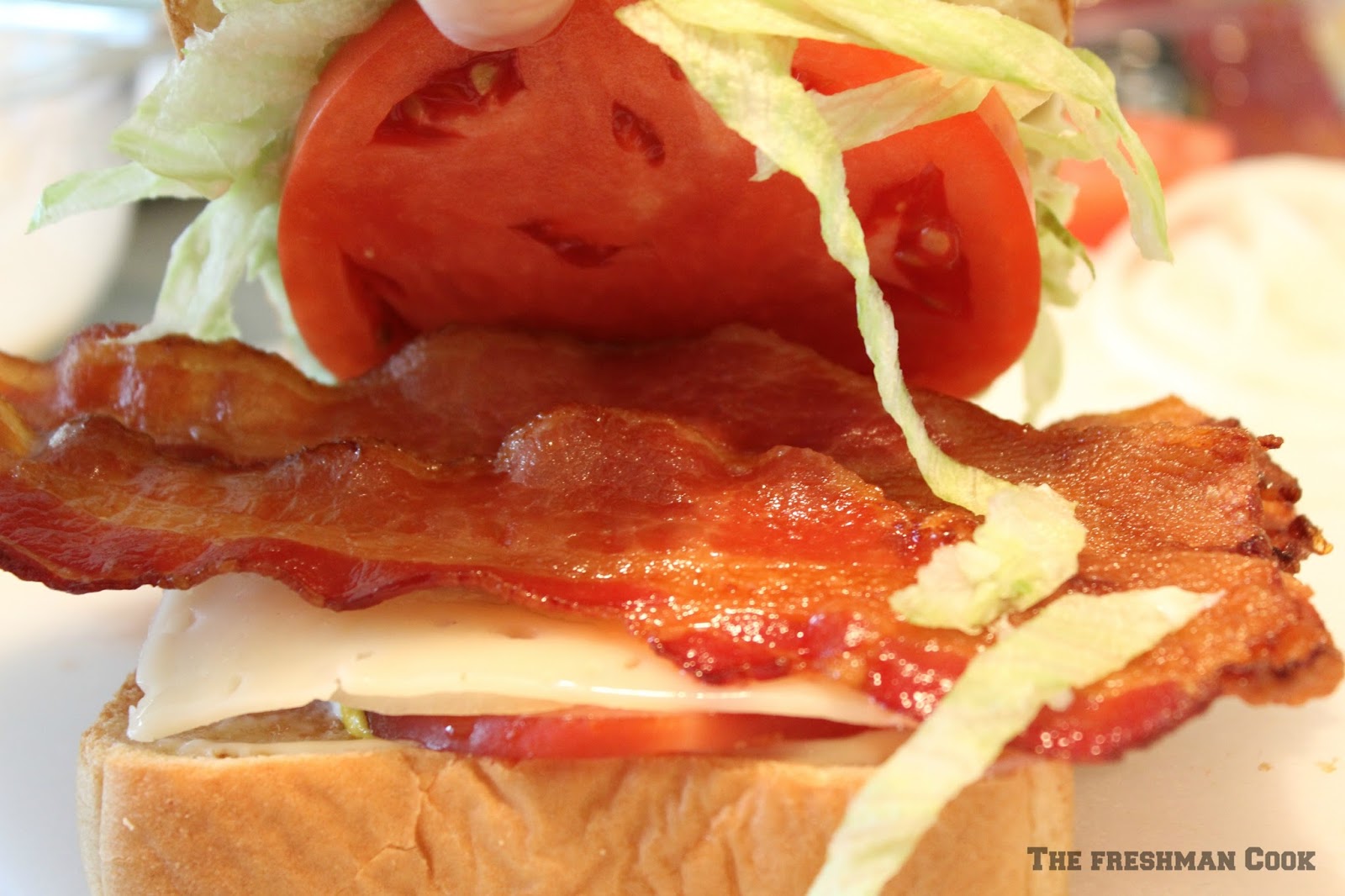 Start building the BLT by spreading both untoasted sides of the bread with mayo. Place mustard on the bottom piece, on top of the mayo. Top with 2 pieces of Canadian Bacon, slices of onion, and a slice of swiss cheese.