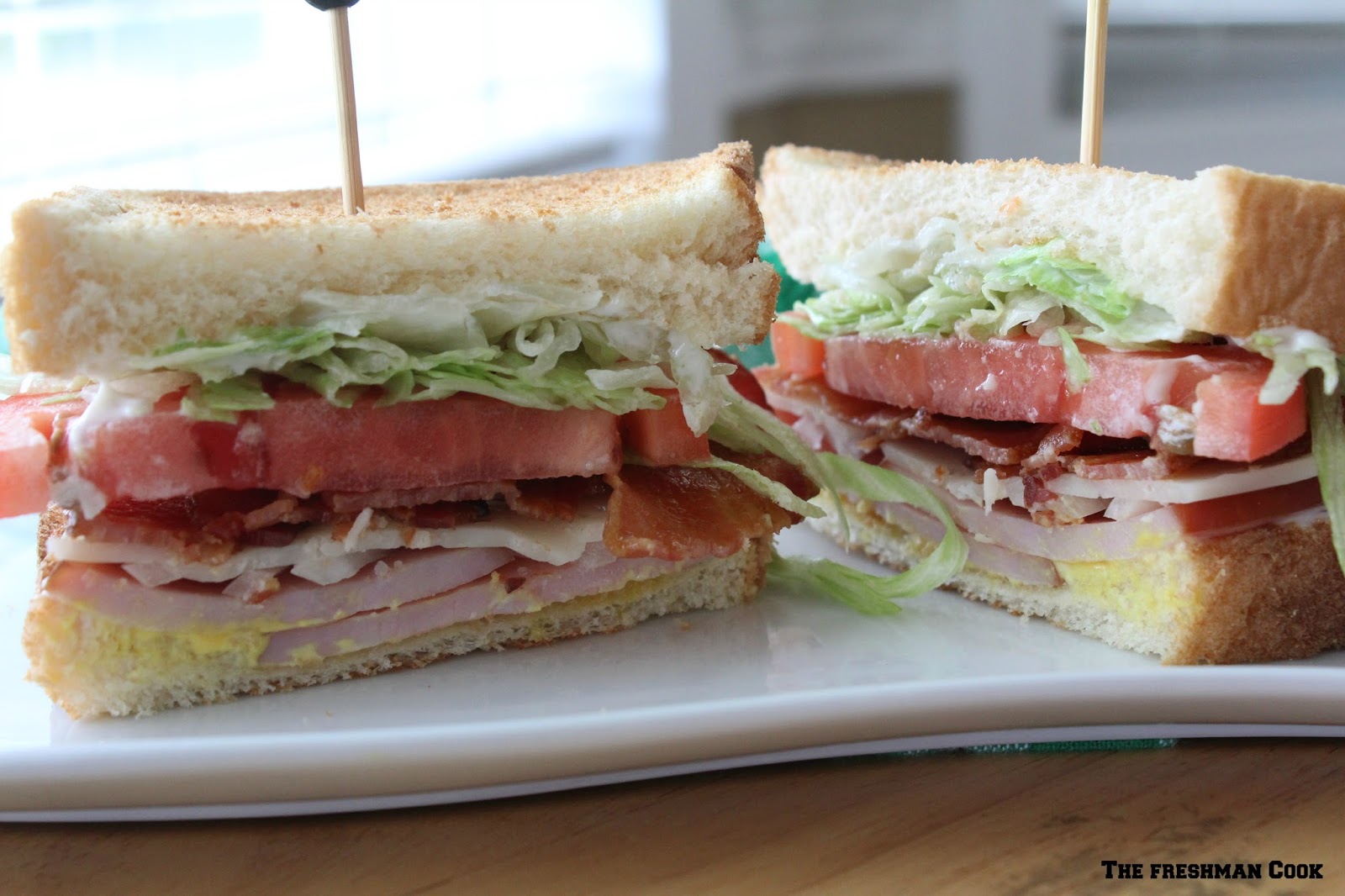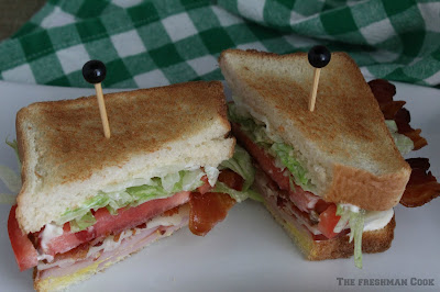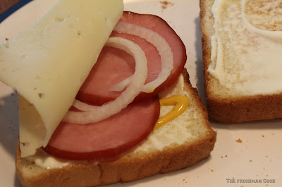 Start building the BLT by spreading both untoasted sides of the bread with mayo. Place mustard on the bottom piece, on top of the mayo. Top with 2 pieces of Canadian Bacon, slices of onion, and a slice of swiss cheese.