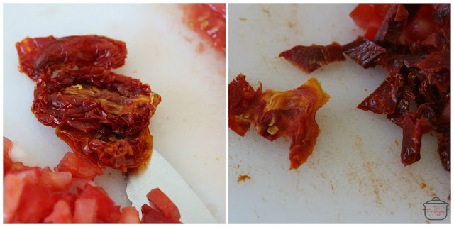 - Chop the sundried tomatoes in to small pieces as shown. Remove any parts of the tomatoes that contain seeds. You do not want any seeds in the bruschetta. The seeds will look yellow through the red skin.