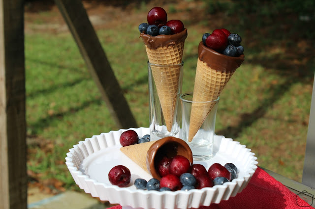 Once chocolate has set up on cones, fill cones with a mix of the fruit!