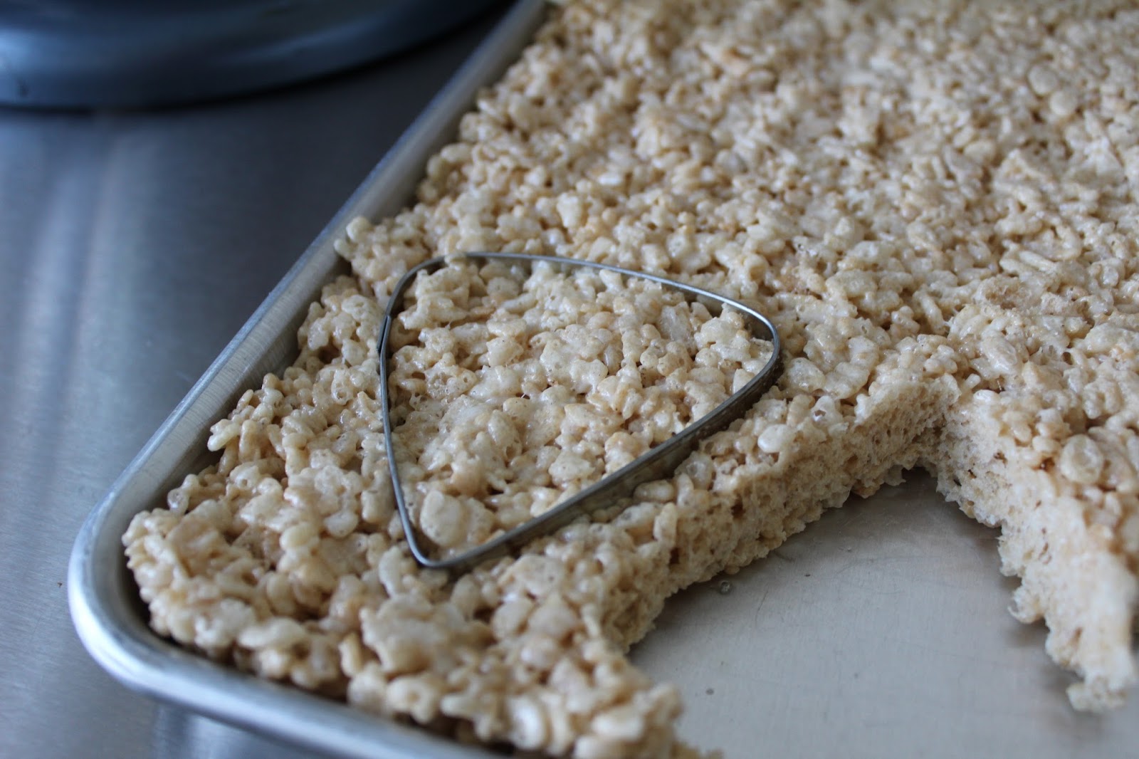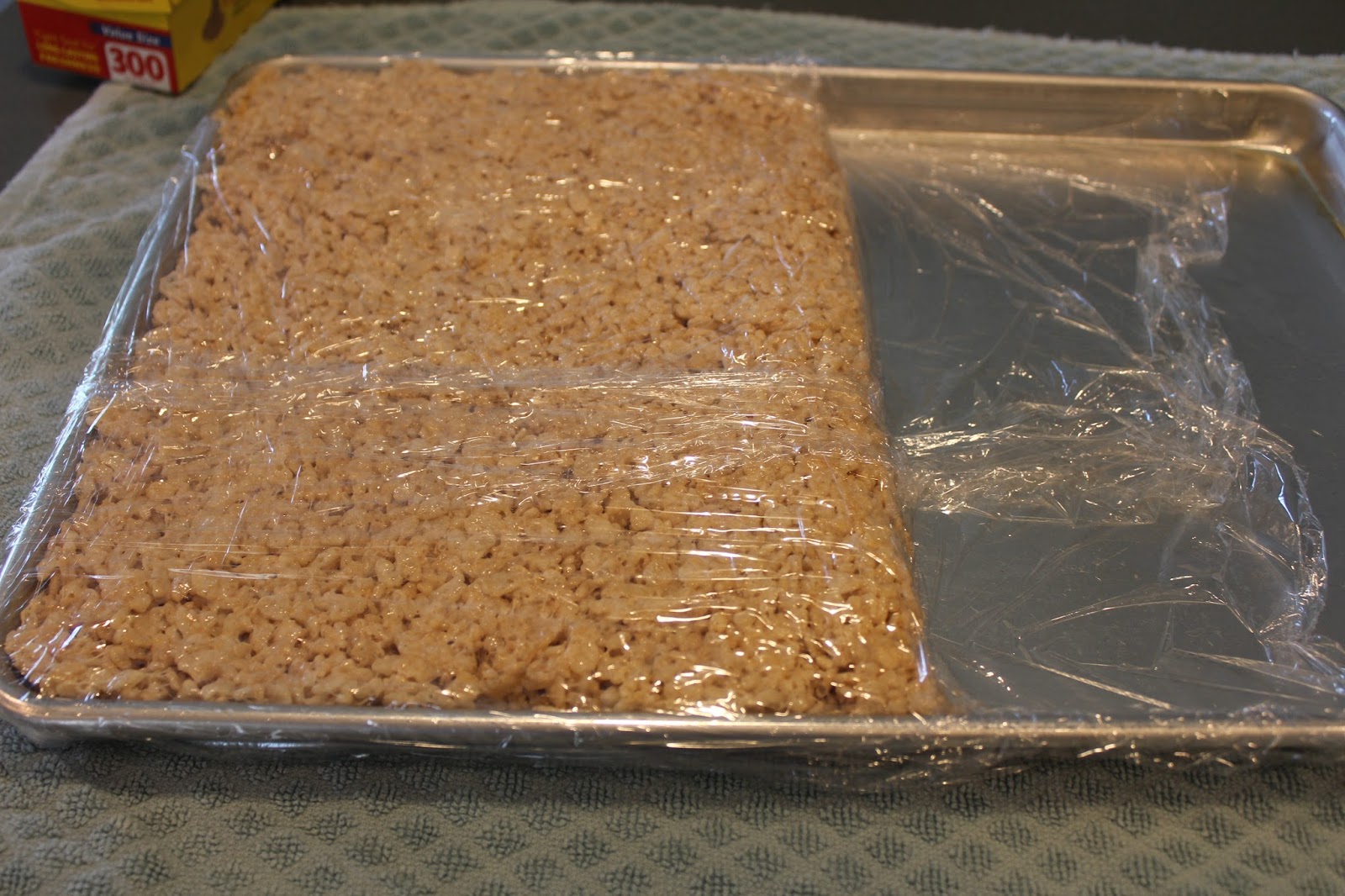 Place the mix into a buttered or sprayed half sheet pan, or any pan that has sides the same height as the sheet pan. Cover with plastic until cooled. The rice krispie treats should be even across the top with the top of the pan.Â