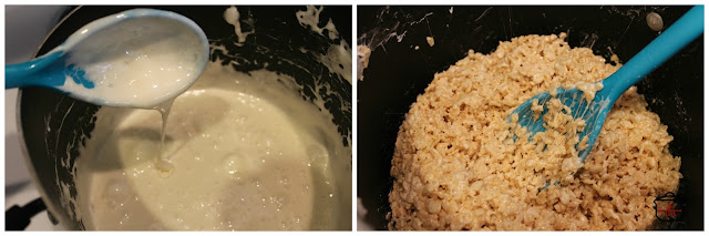 Most cooks know how to make rice cereal treats, but just in case it has been a while, here’s what to do: Melt the butter in a large saucepan, over low heat. Add the marshmallows to the butter and stir until they are completely melted. Remove the pan from heat. Add the cereal, and mix together until covered completely.
