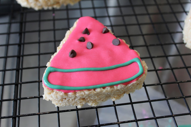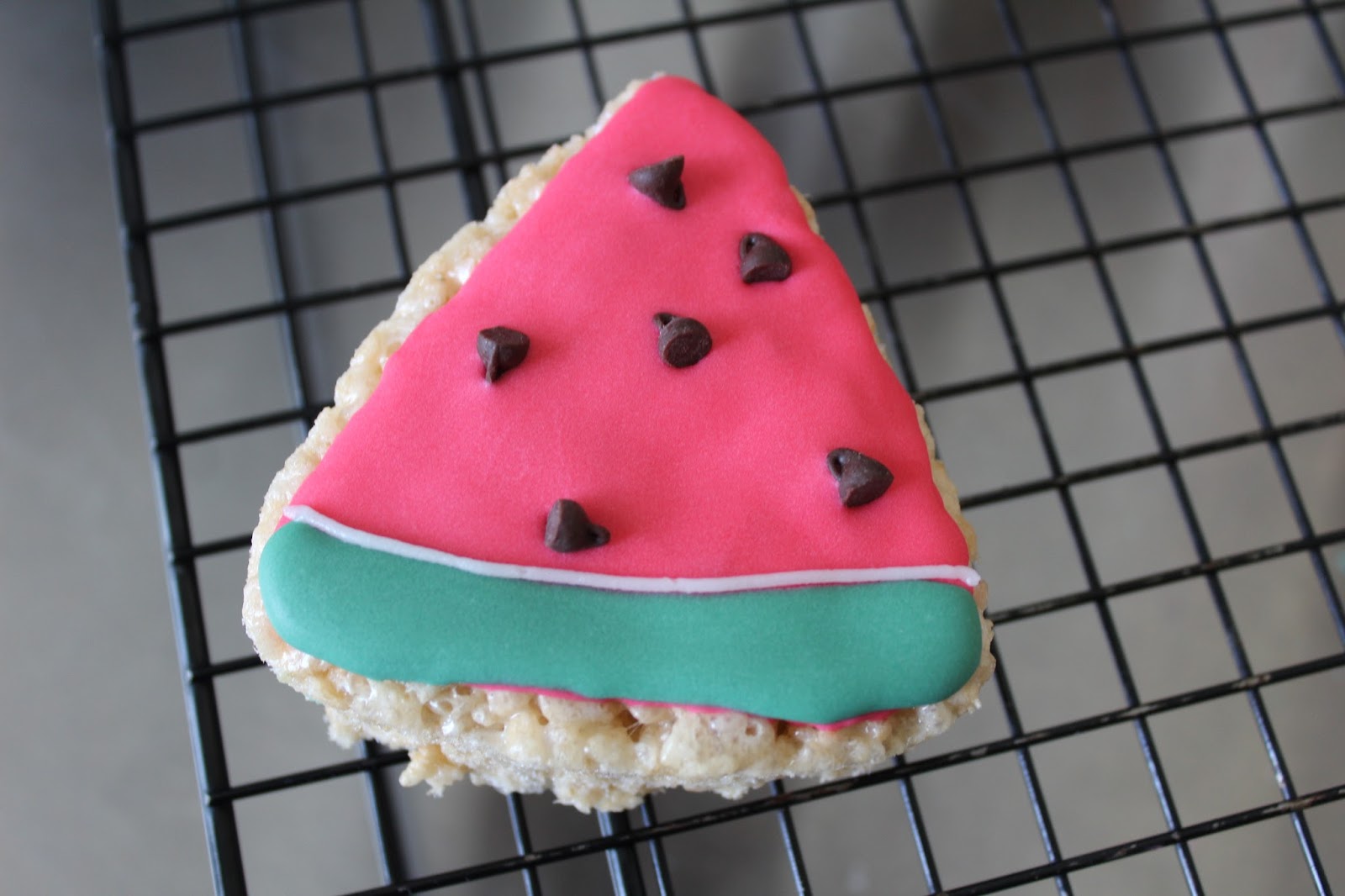 - Cut out the watermelon slices. Using the space sparingly, you should get 12-13 watermelon slices from the rice krispie.