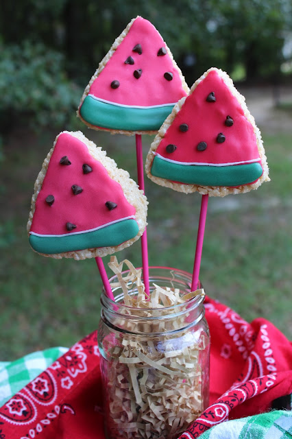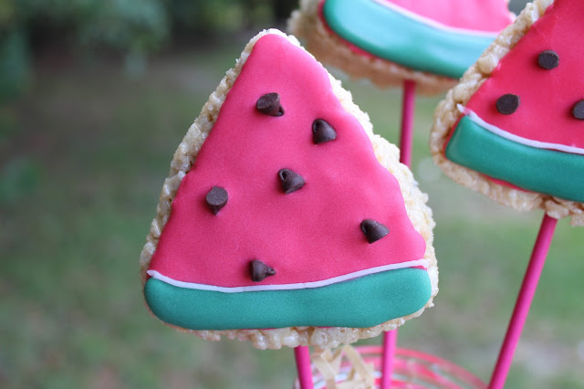 - Mix the pinkish red color together. Use your favorite recipe, or use my favorite. I have used this recipe for years, and I think you will like it! Use a decorating bag and a #2 tip to outline the watermelon slice and then fill it in. Drop approx. 6 mini chocolate chips onto the top 3/4’s of the treat. Insert stick into the bottom of the watermelon wedge. Let dry.