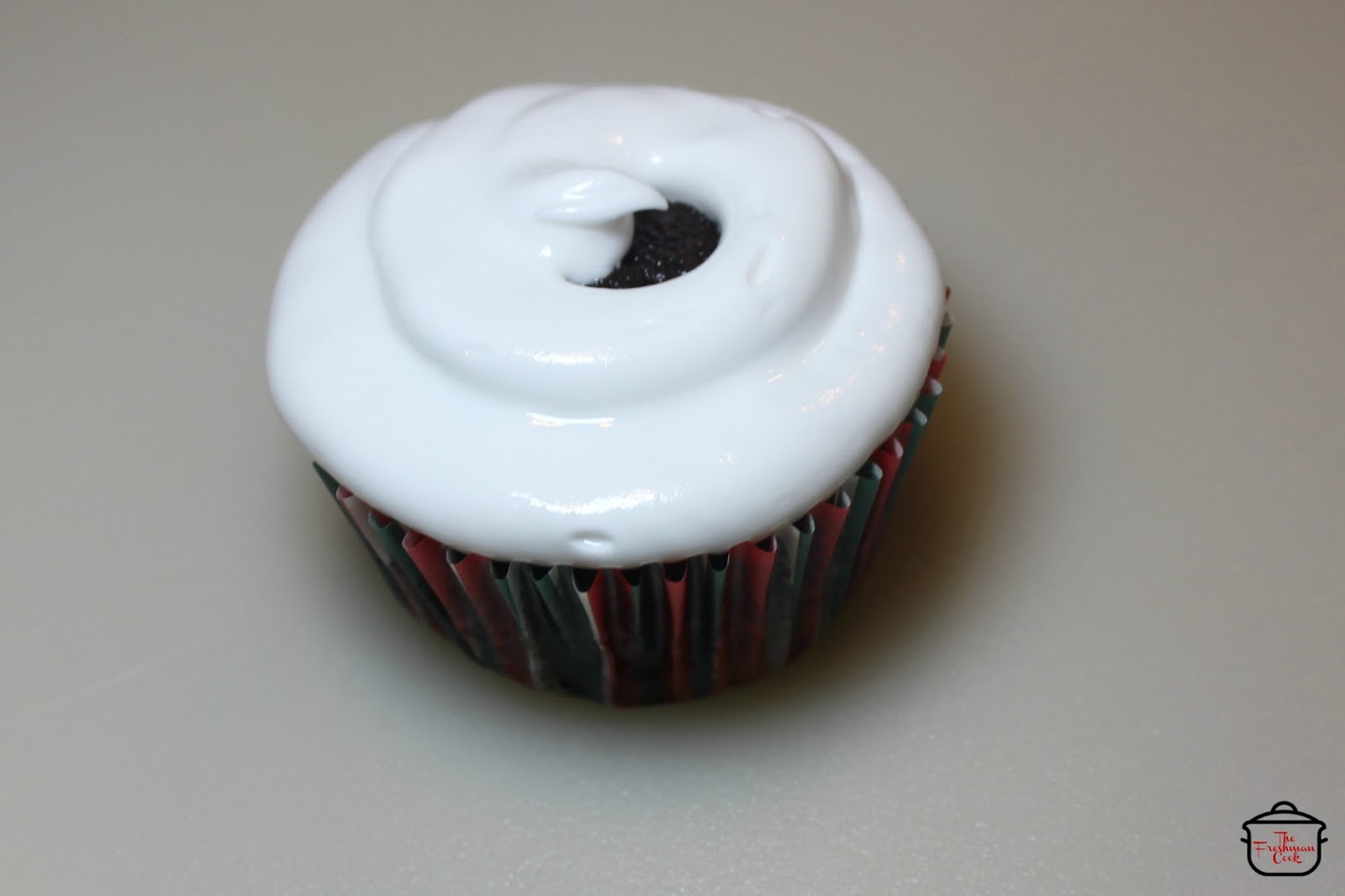 - Use any round tip, and cover the top of the cupcake with white frosting. You can do all these at once, or one at a time. If you ice them all at once, then as you ice them, place a sugar cone upside down on the cupcake.