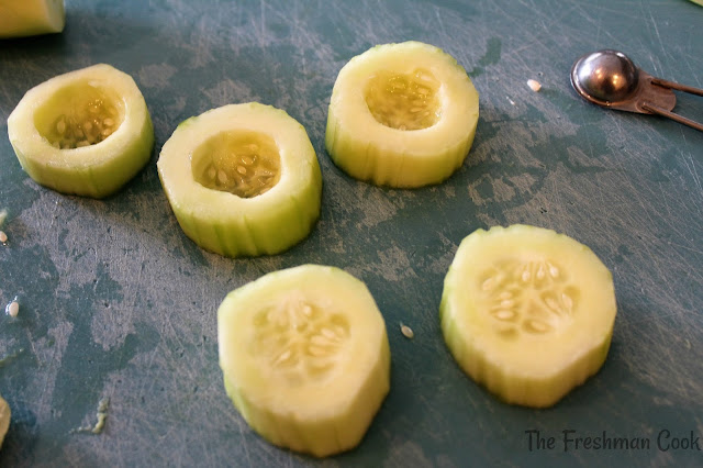 Wash and peel your cucumbers. Cut into slices approx. 3/4″ thick. Use a 1/4 teaspoon measuring spoon to scoop out the seeds in the middle of the cucumber. Remember to not cut in to the bottom!