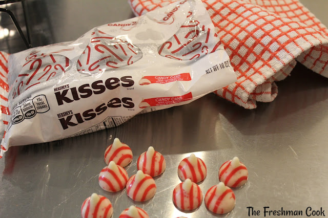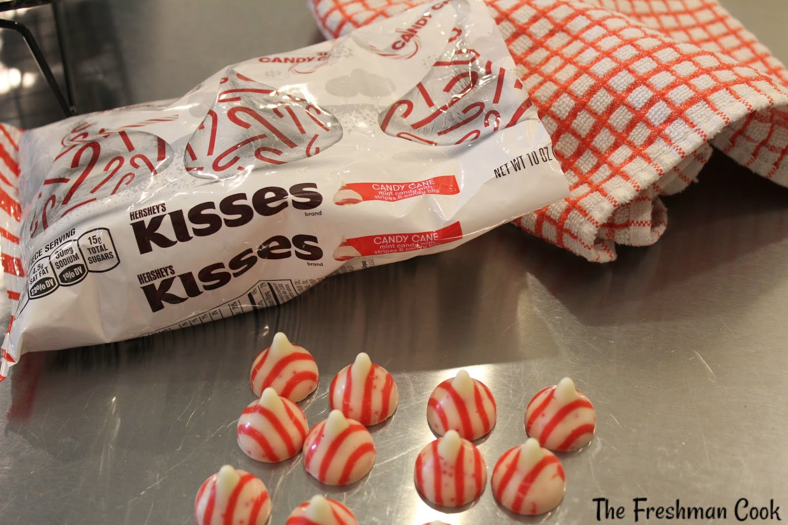 Immediately upon removing the cookies from the oven, place unwrapped candy cane kisses onto each cookie. Let cool.