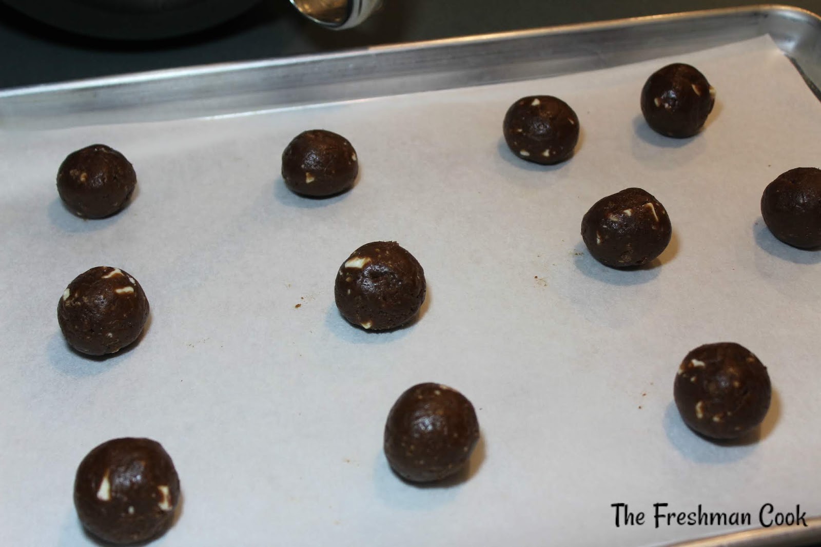 - Start scooping the dough into a scoop, if available. You can also use a spoon. You want your dough balls to be very close in size. Place on a cookie sheet, leaving space like above.Â