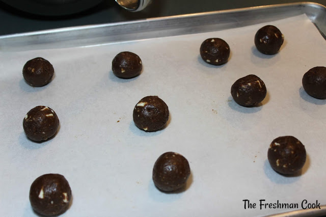 Start scooping the dough into a scoop, if available. You can also use a spoon. You want your dough balls to be very close in size. Place on a cookie sheet, leaving space like above.Â