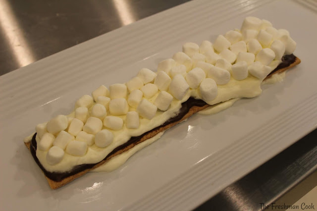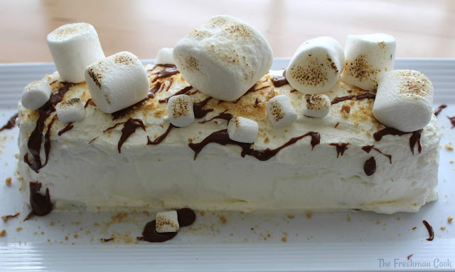 This cake needs to be made at least 24 hours before you want to serve it. It is very simple to make, because all your “baking” is done in the fridge. I used graham crackers for the cake portion of the dessert, and whipped cream for the “frosting”. While it is “cooking” in the refrigerator, the whipped cream will soften the graham crackers, making them as soft as cake! I added a chocolate ganache for the chocolate bar, and I used mini marshmallows toasted with a kitchen torch for the fun flavor!