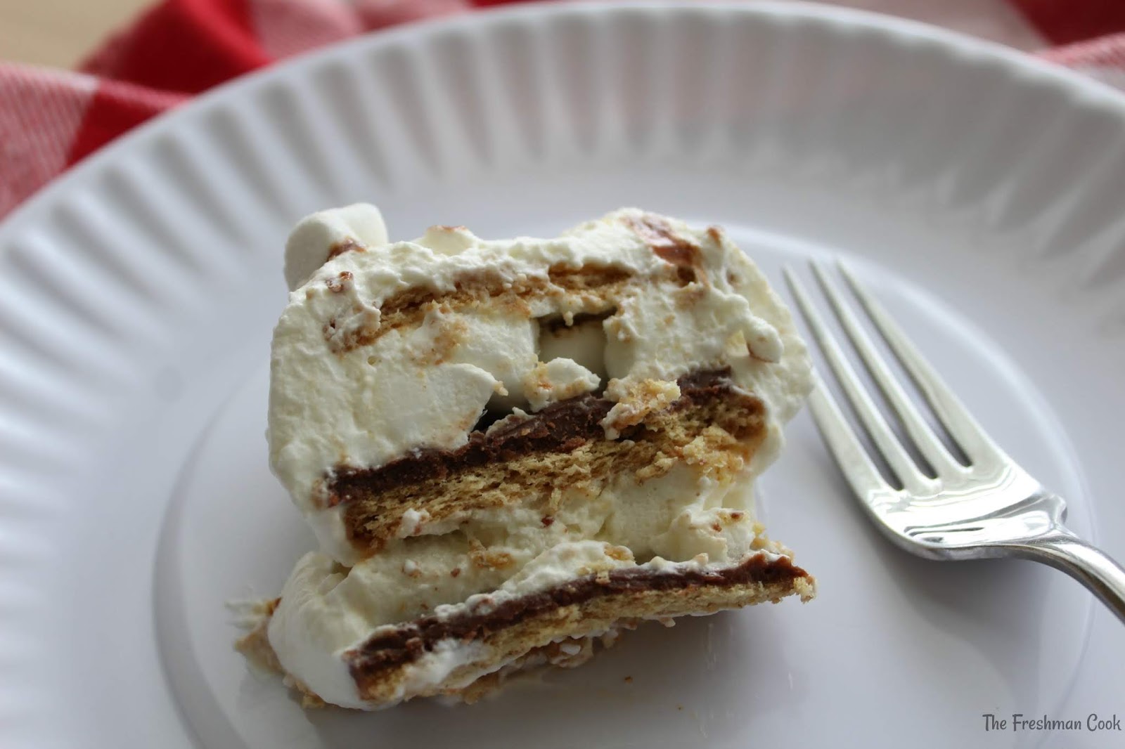 This cake needs to be made at least 24 hours before you want to serve it. It is very simple to make, because all your “baking” is done in the fridge. I used graham crackers for the cake portion of the dessert, and whipped cream for the “frosting”. While it is “cooking” in the refrigerator, the whipped cream will soften the graham crackers, making them as soft as cake! I added a chocolate ganache for the chocolate bar, and I used mini marshmallows toasted with a kitchen torch for the fun flavor!