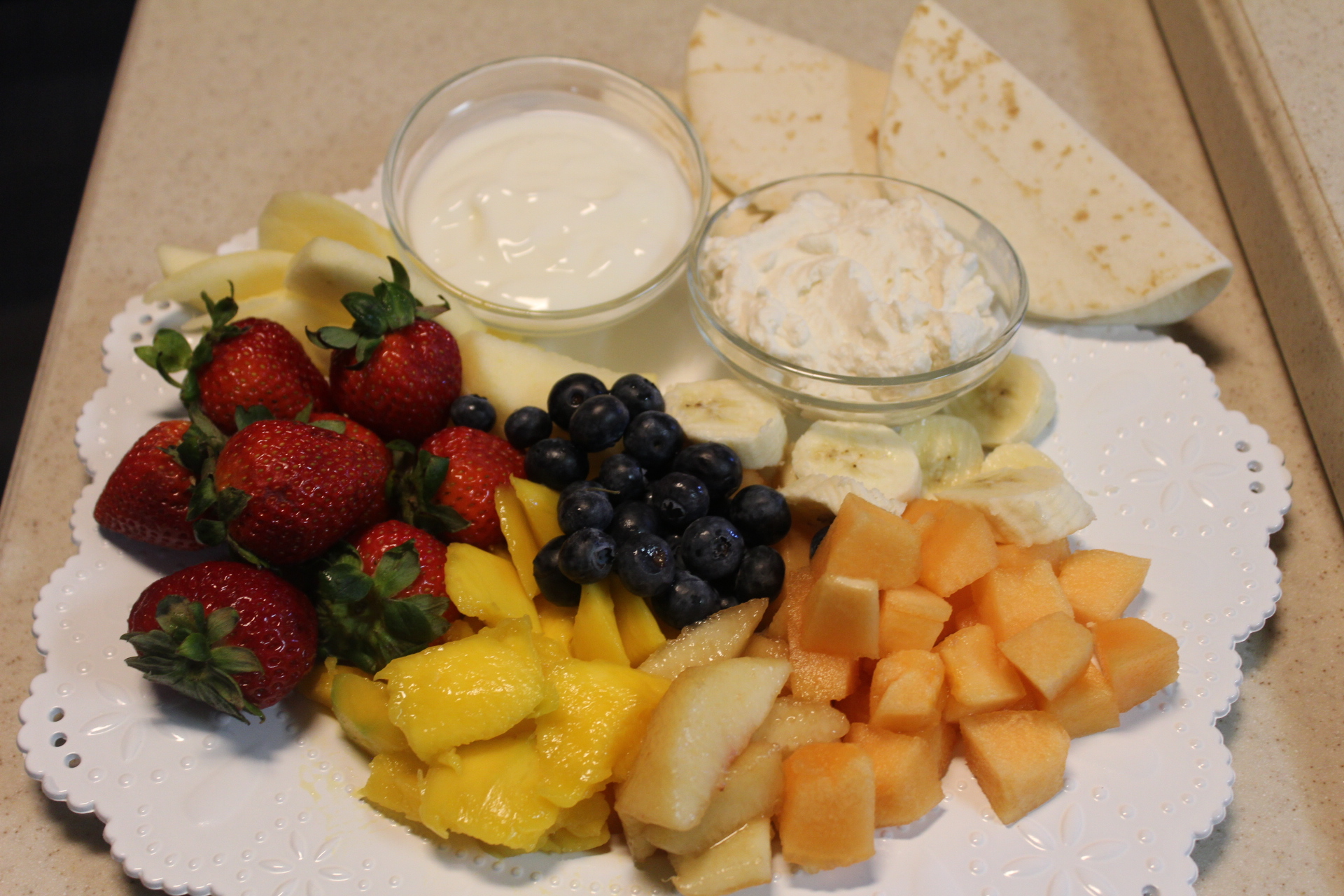 One of the small bowls contains the whipped cream and the other one has light vanilla yogurt in it. I also included a few mini tortillas, which are the perfect addition to this plate! They can be filled with your favorite fruit and topped with a bit of whipped cream or fill them with a little bit of each fruit and add a spoonful of yogurt for a fun and tasty treat! They are a favorite for kids!