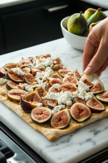 - Layer Ingredients: Evenly distribute the sliced Figs and Prosciutto over the flatbread. Sprinkle the crumbled Goat Cheese on top.