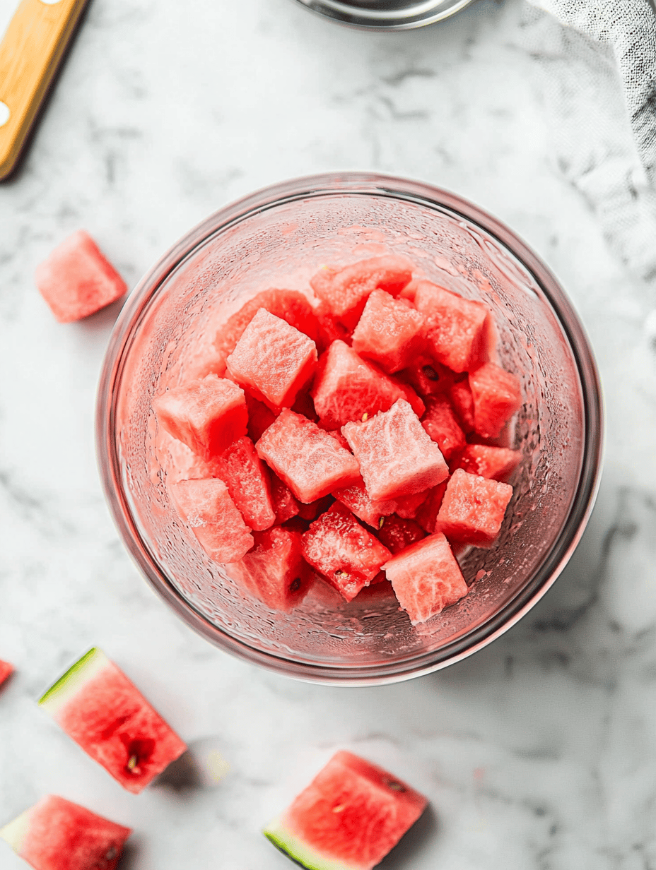 - Begin by blending the watermelon chunks until smooth and vibrant pink in color.