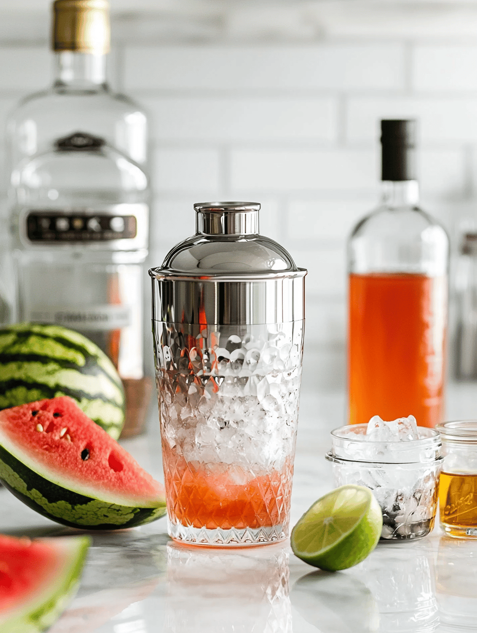 - Fill a cocktail shaker with ice, then pour in the watermelon juice, a splash of lime juice if desired, the cooled honey syrup, and gin.